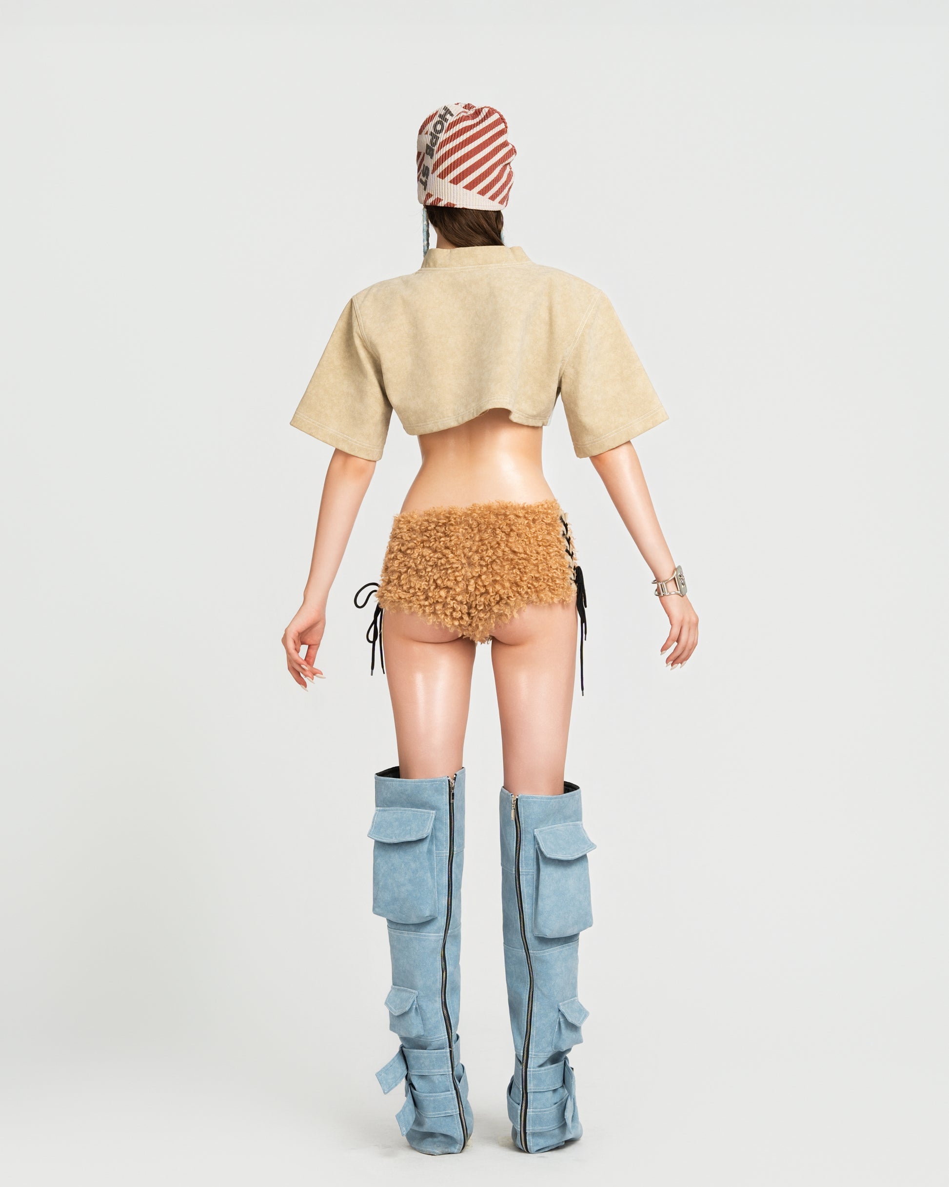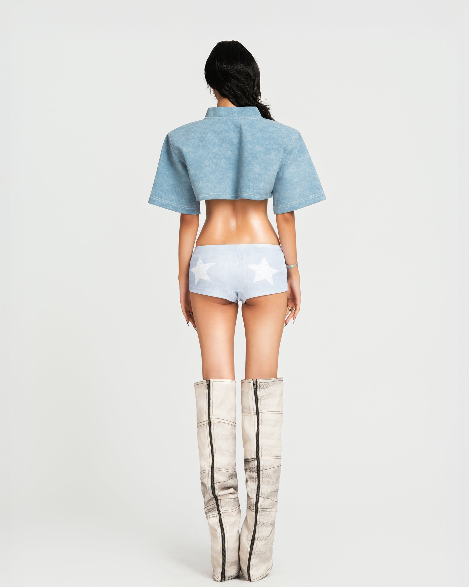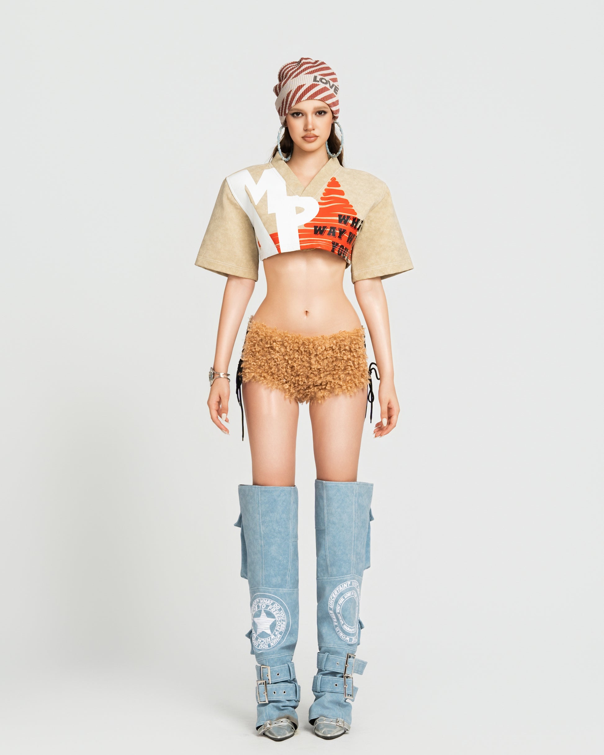 Detail: Short cropped silhouette hitting just below the bust, wide shoulders with padded structure for upper-body volume, puffed mid-length sleeves, printed lettering and graphics on the front