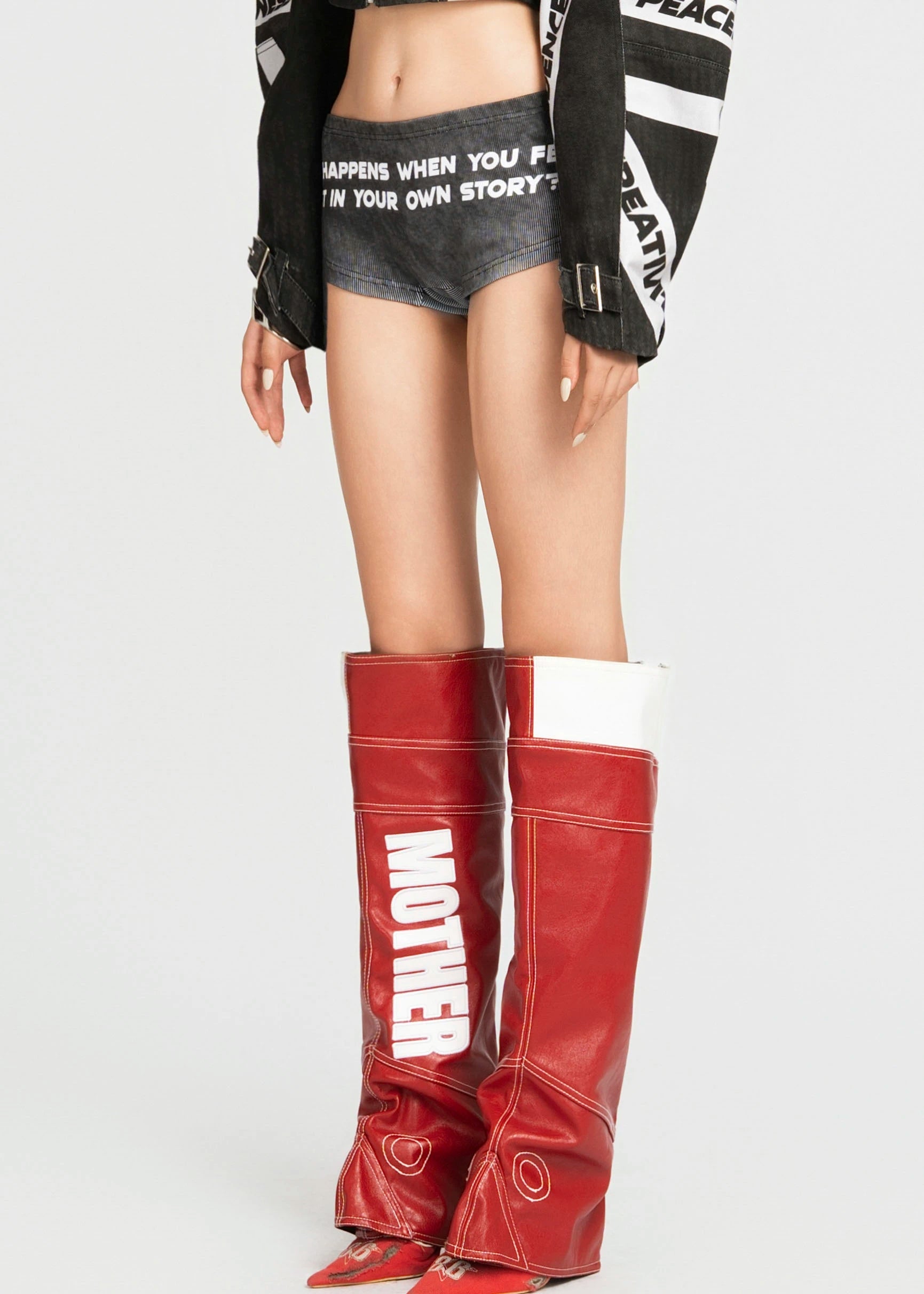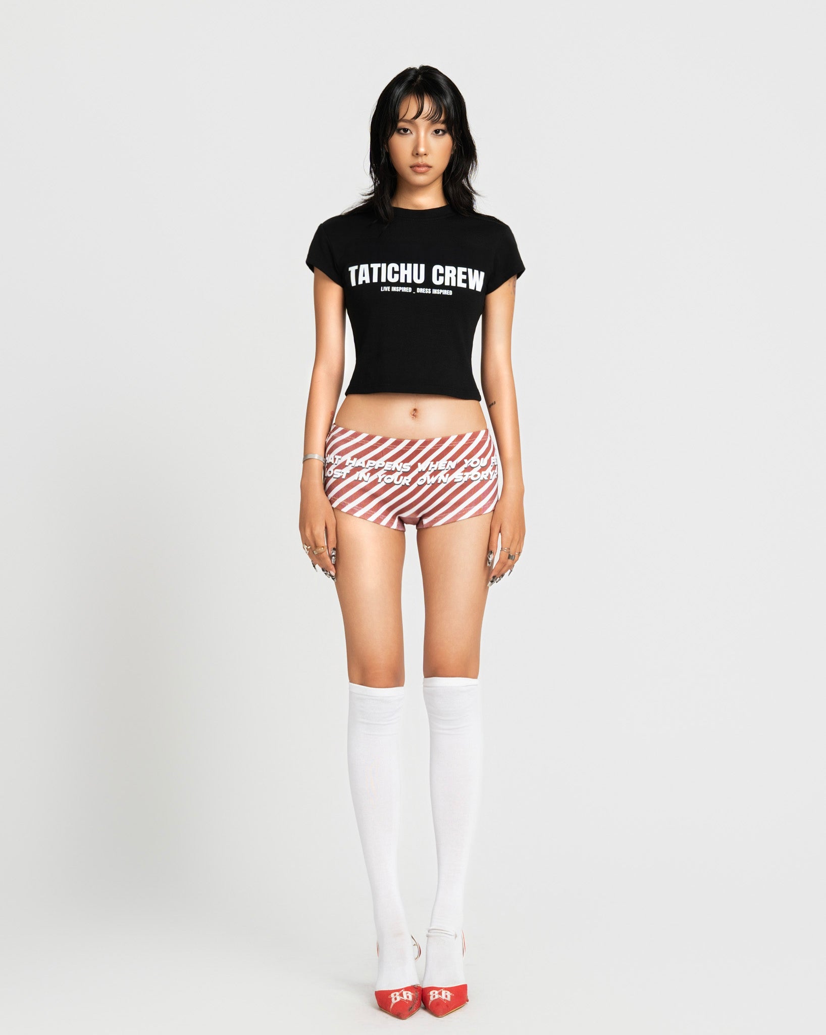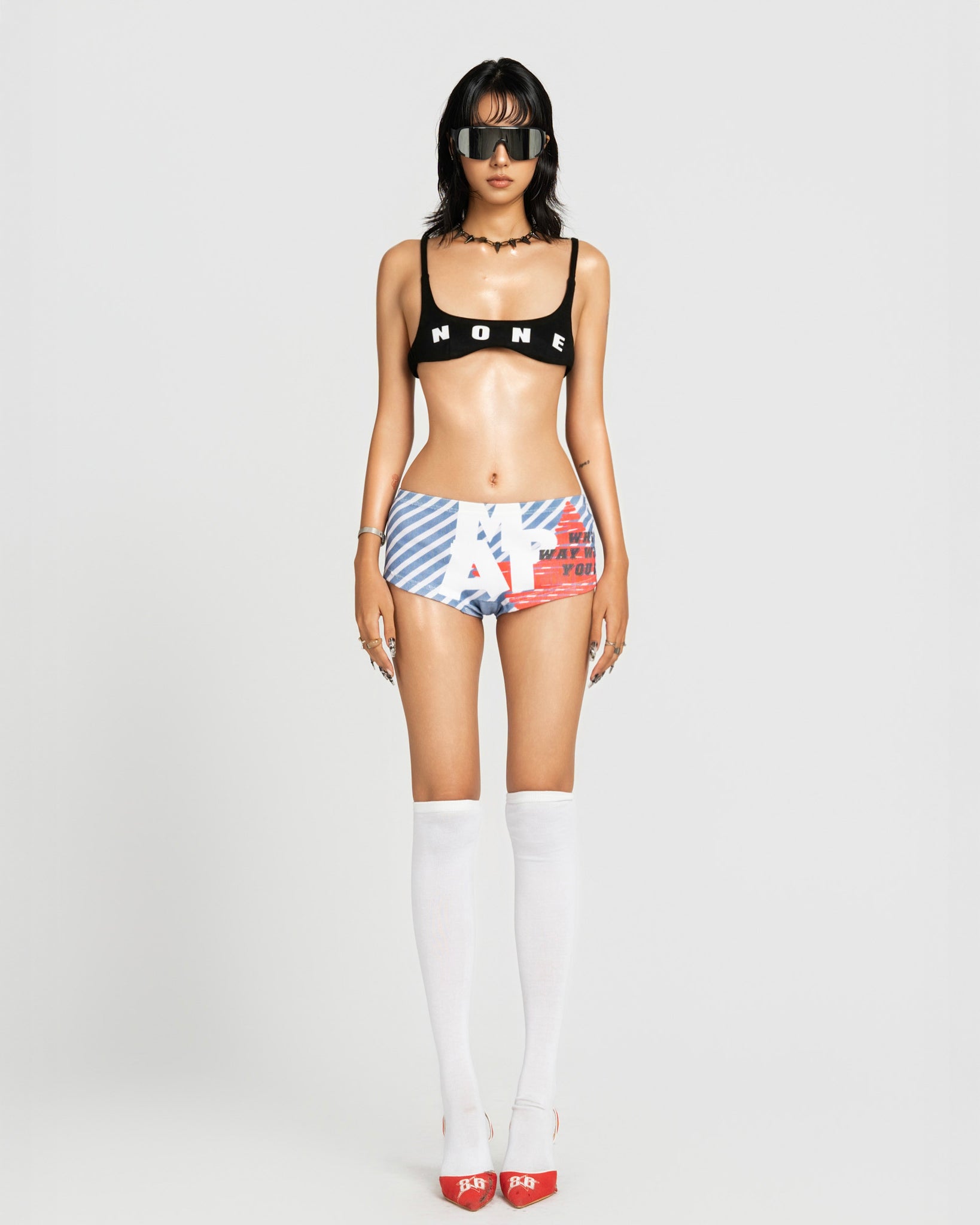 Detail: Printed graphics and lettering for accent, very short thigh-length design fully covering the backside, stretchy ribbed fabric for comfortable movement