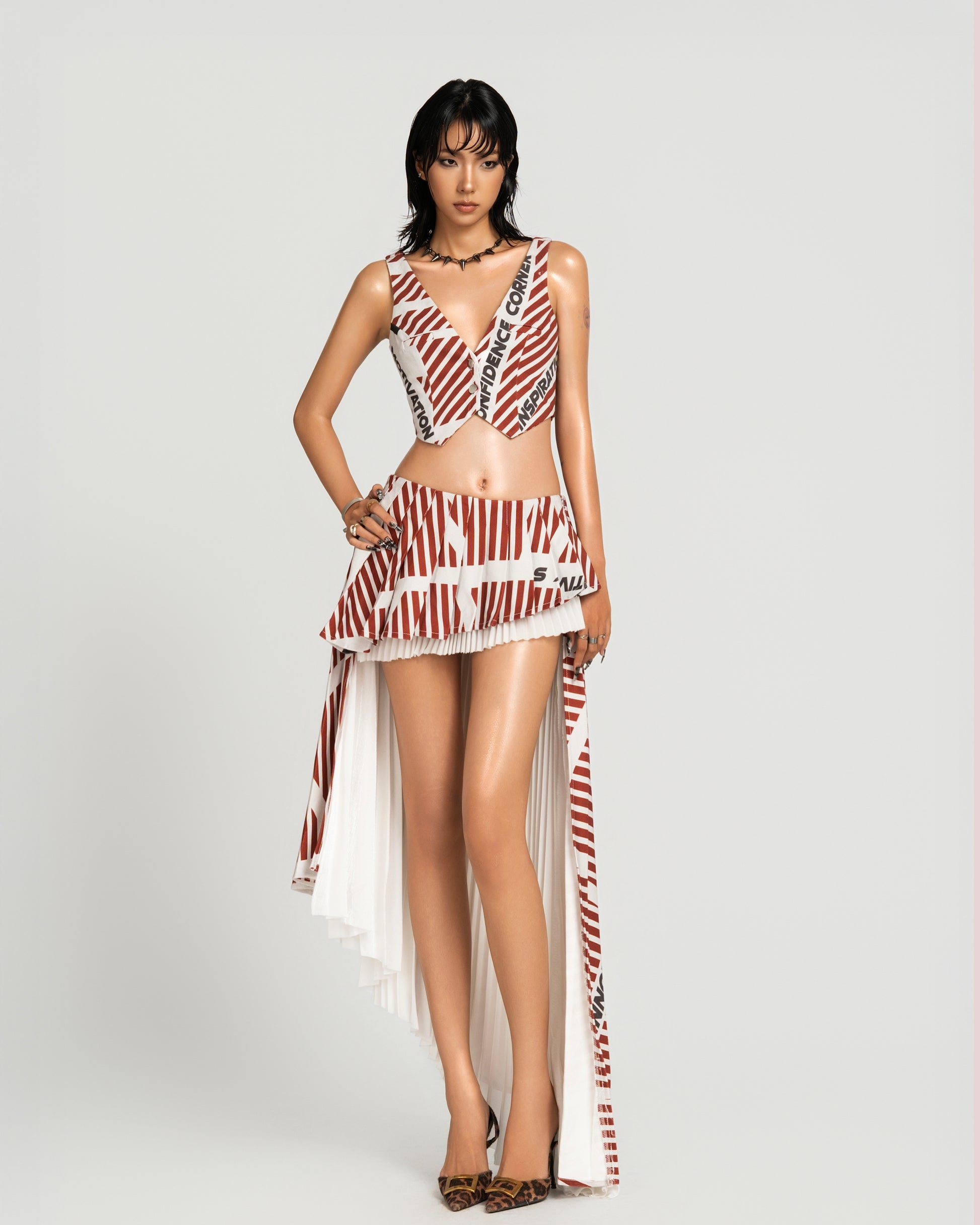 Detail: Printed red-white stripes with black lettering, deep V-neckline for a bold look, cropped just at the waist, button closure