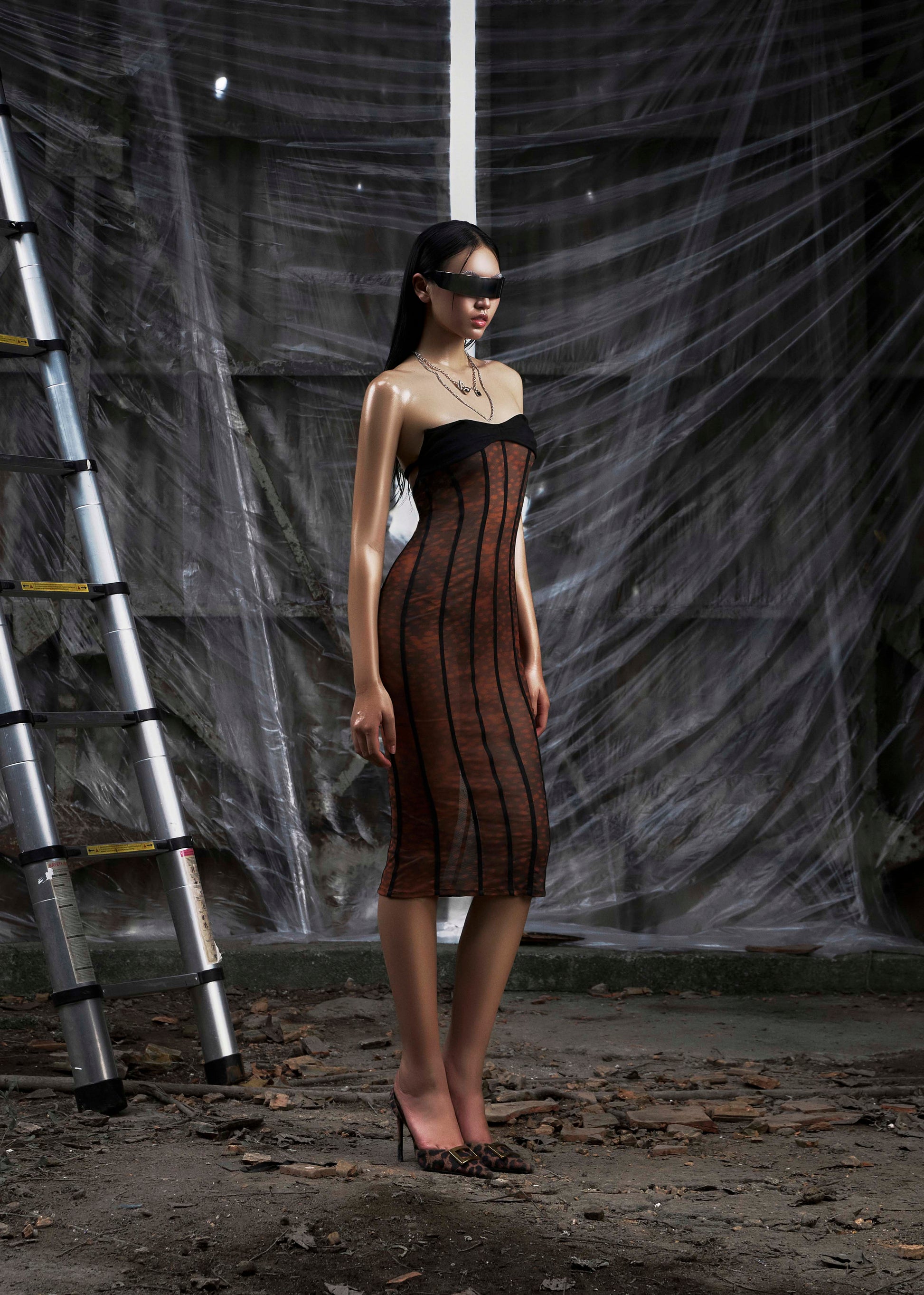 Detail: Amber print, black tight-fitting bust with metal buckle at the back, striped details that hug the entire dress, body-hugging form