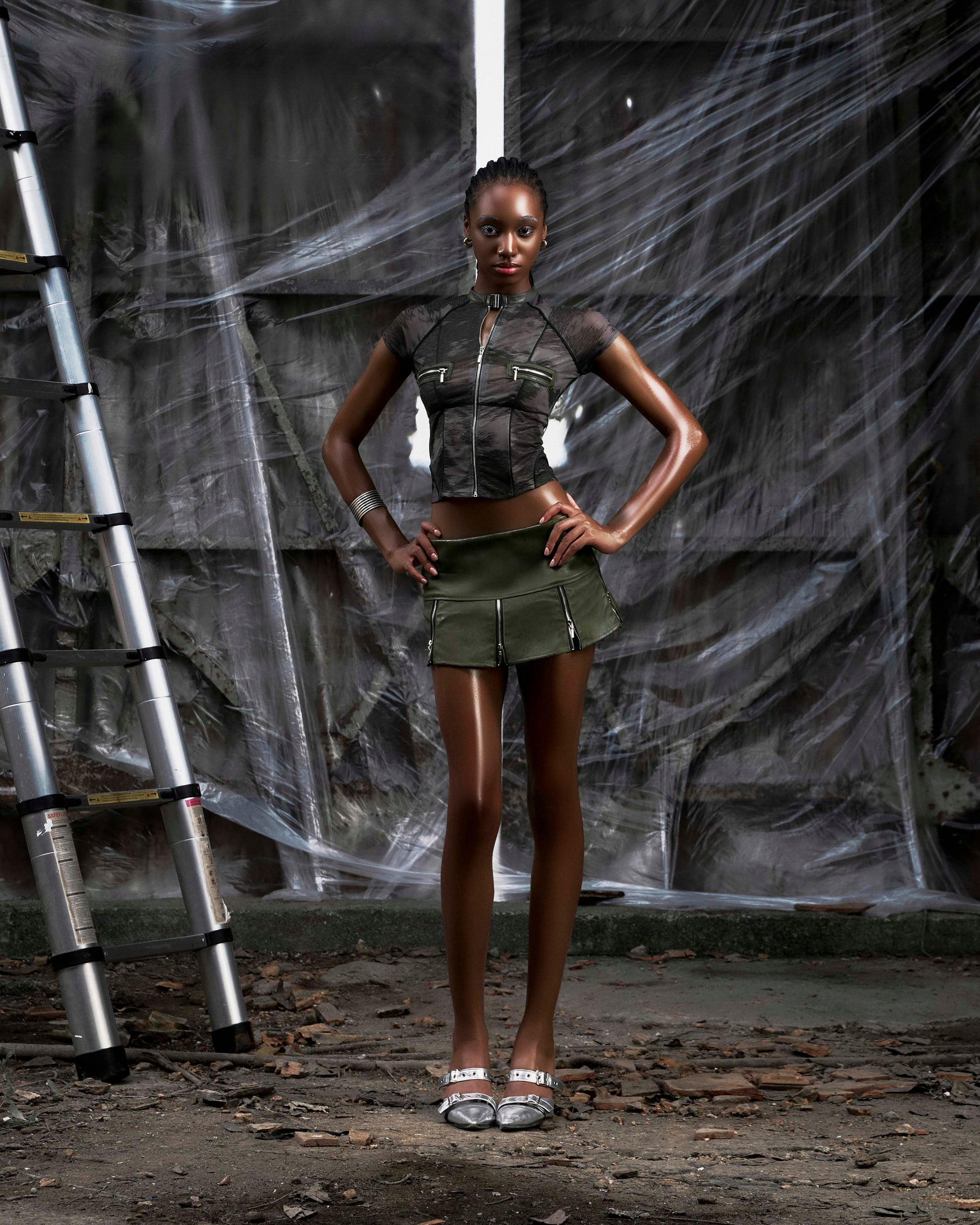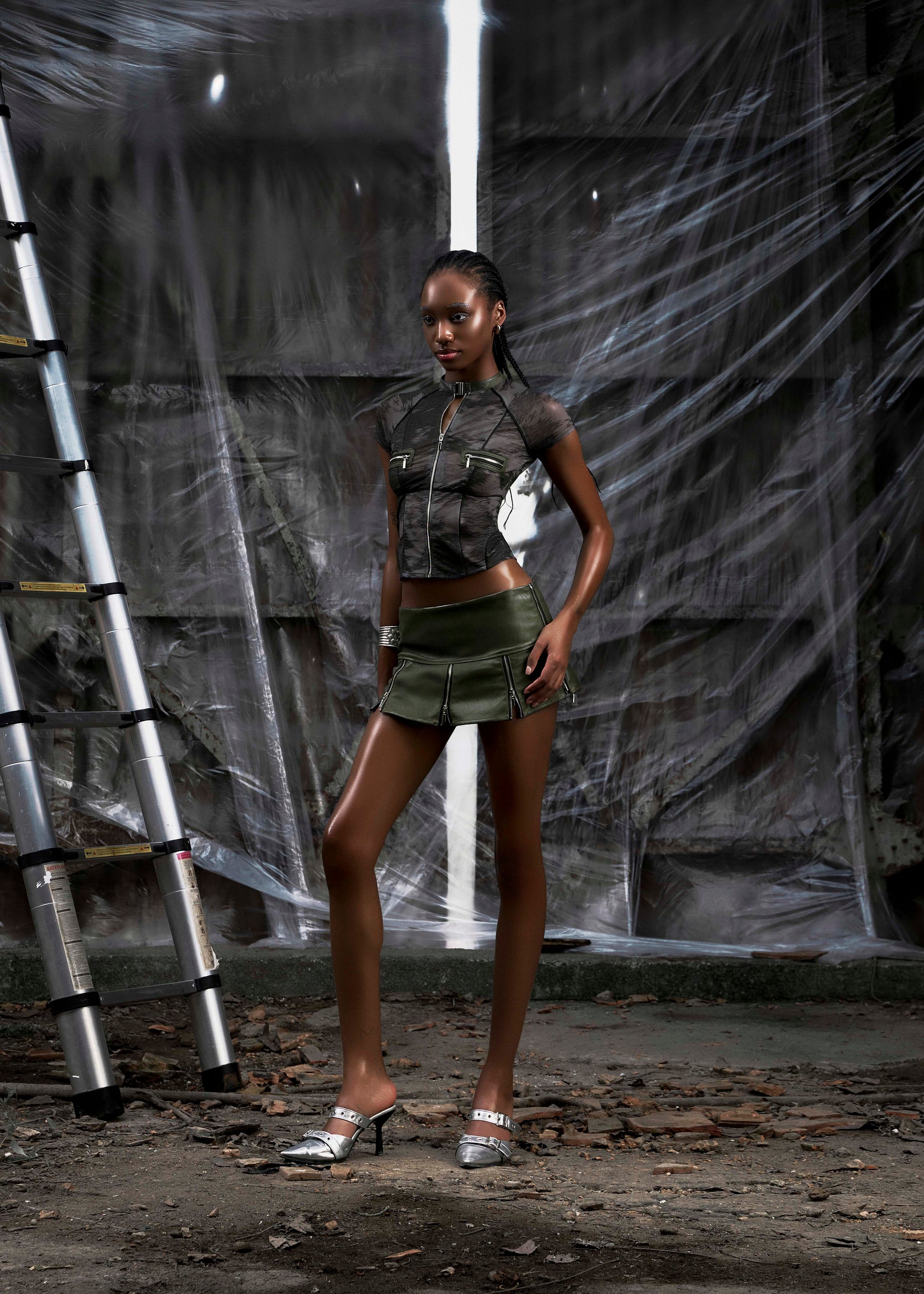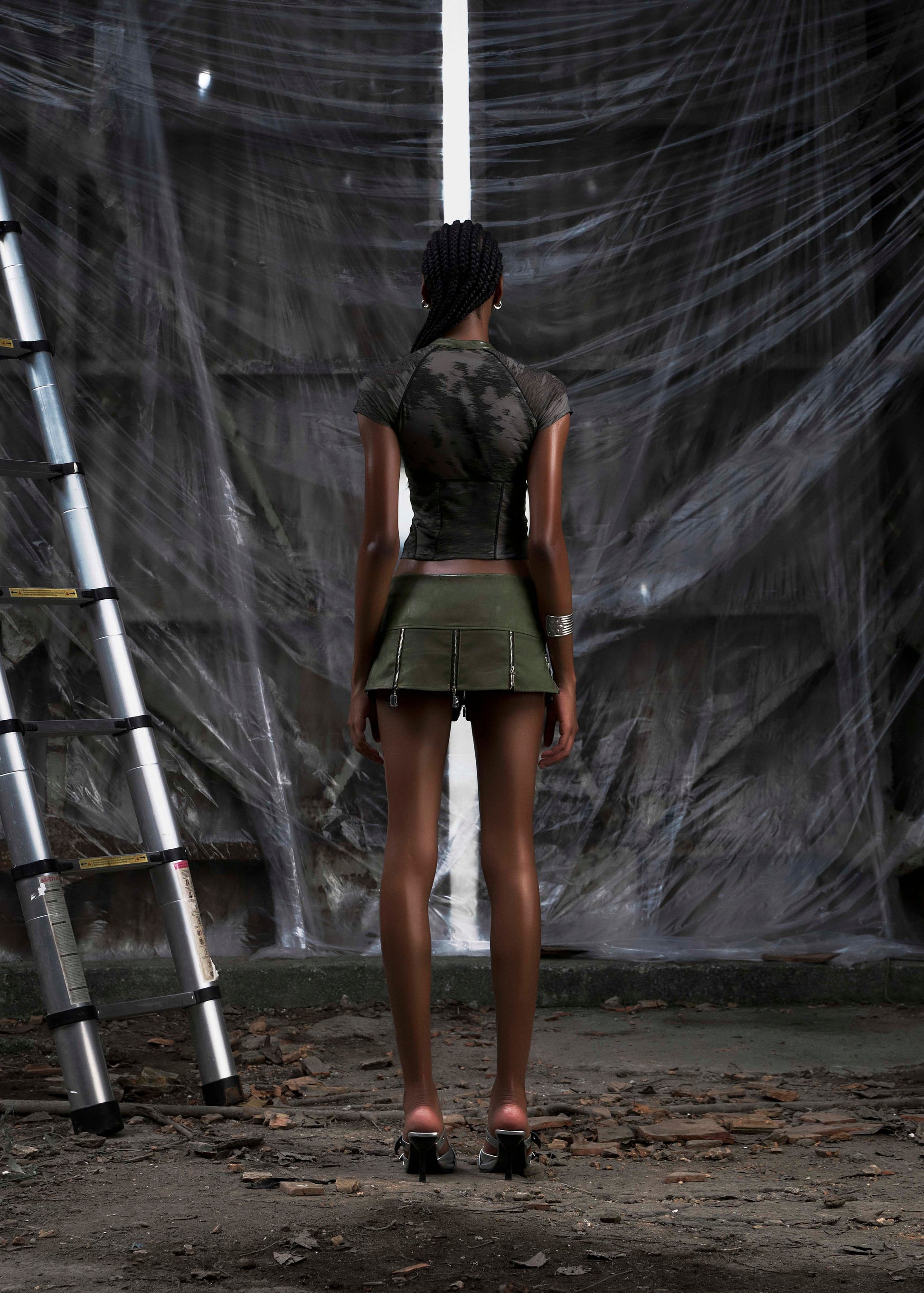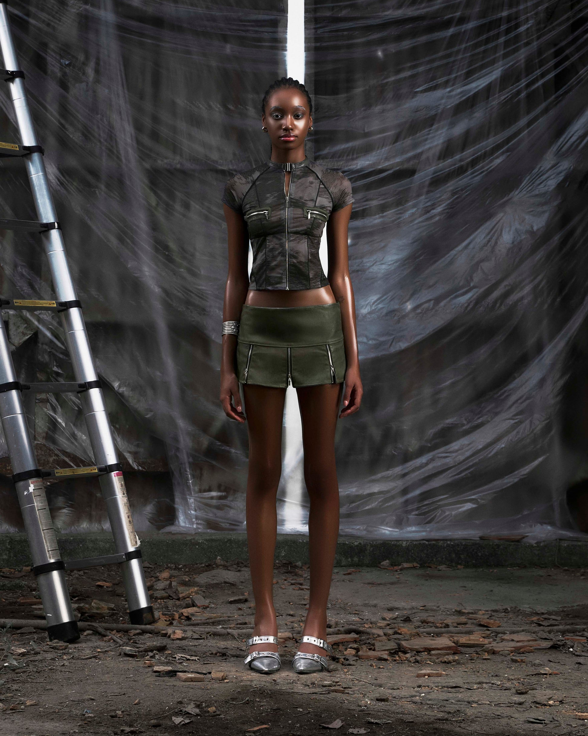 Detail: Dark printed pattern, tight collar with metal buckle, 2 small zippers on both sides of the chest with fake pockets, body-hugging form to flatter the figure