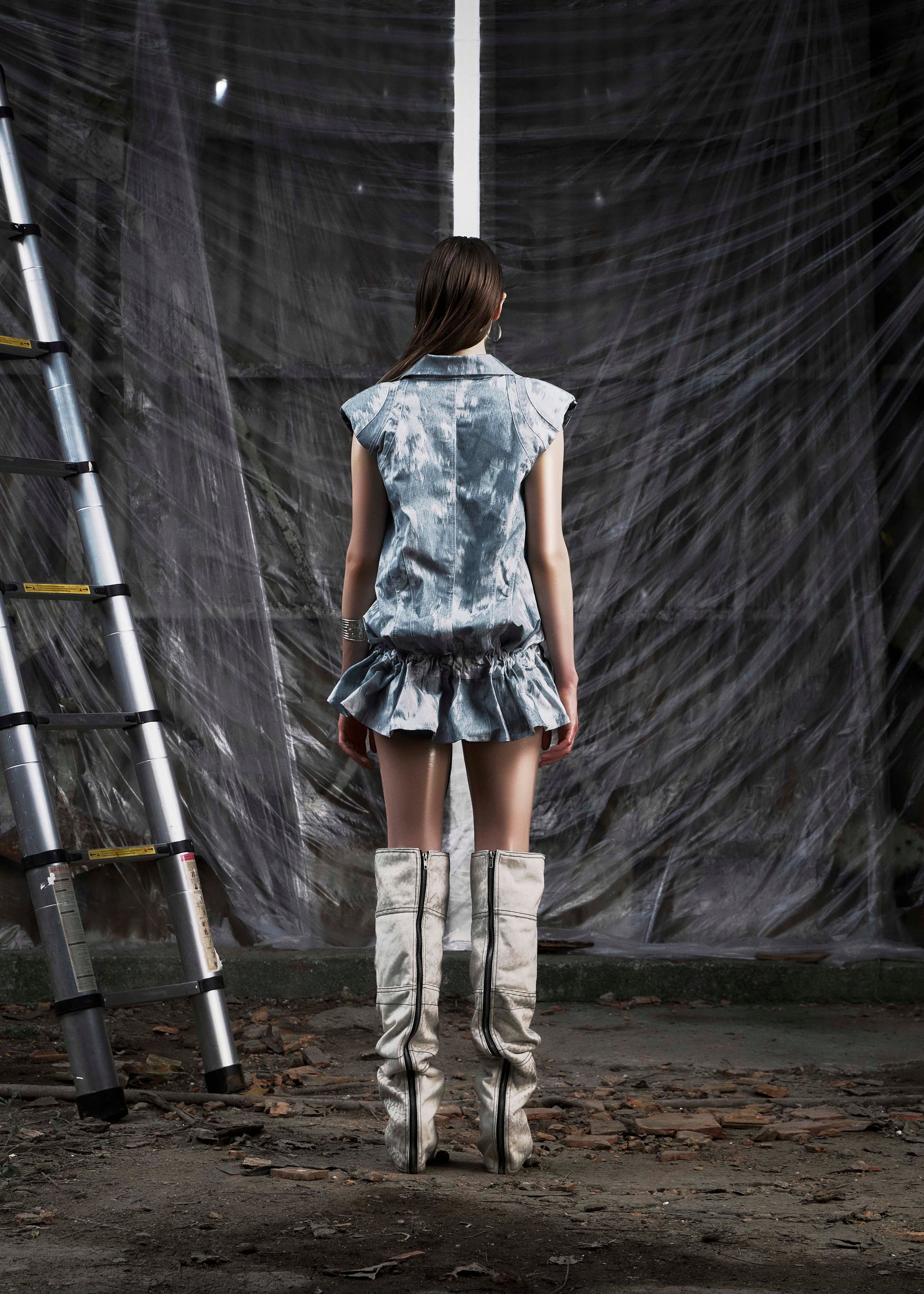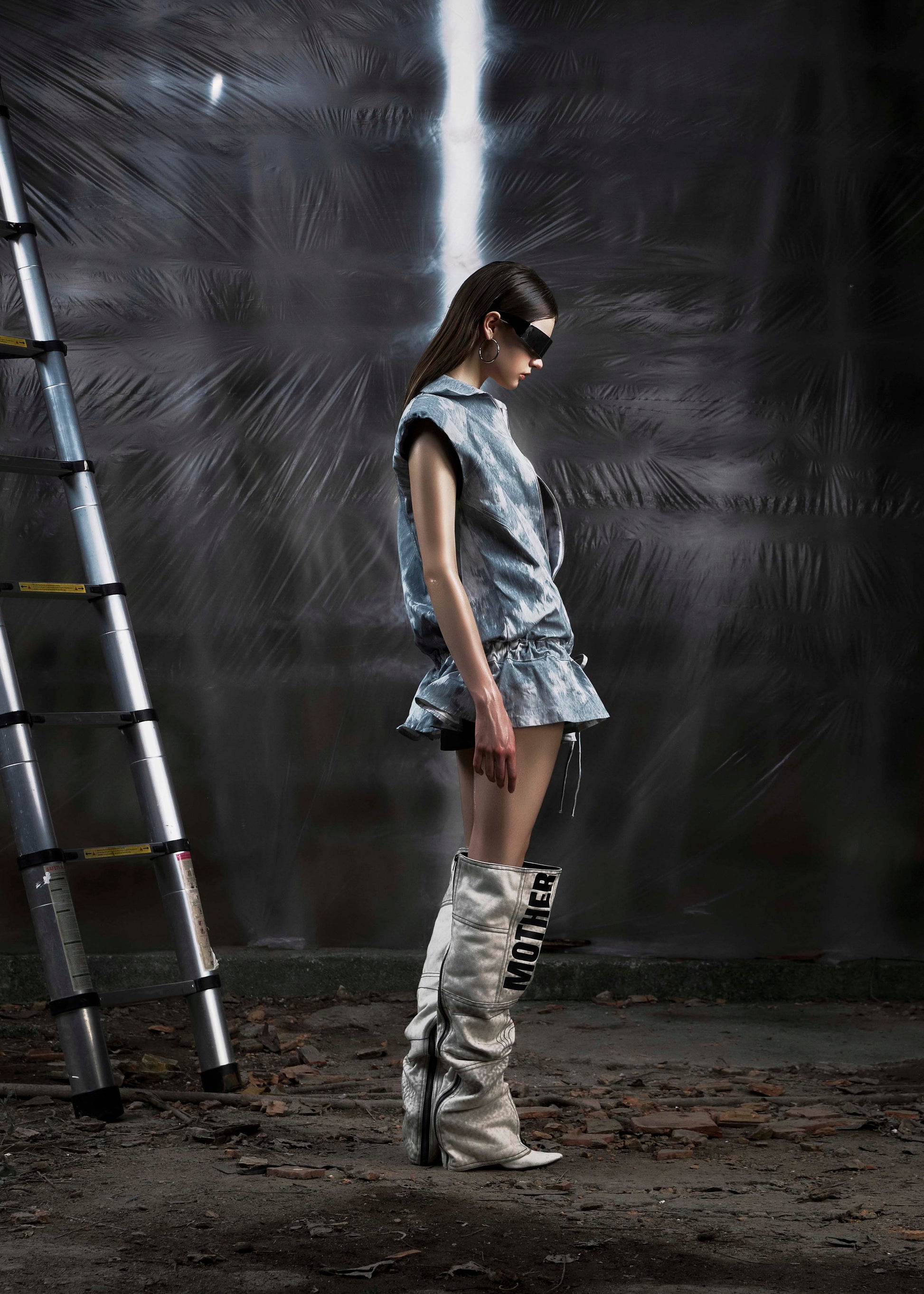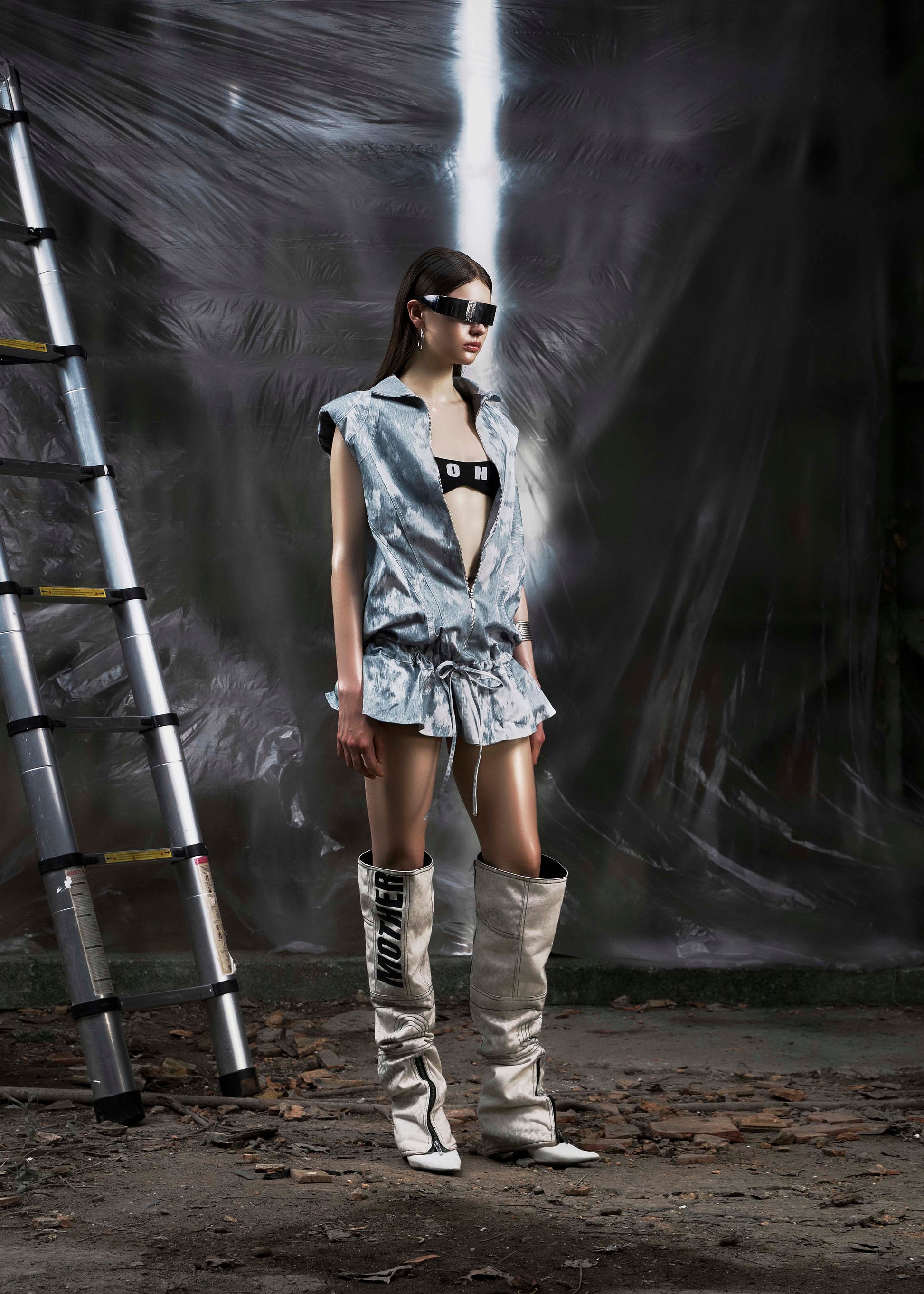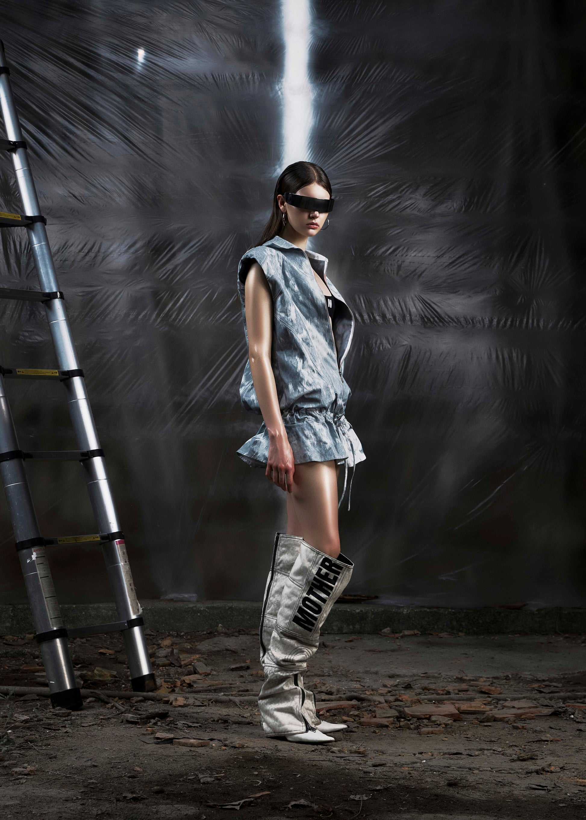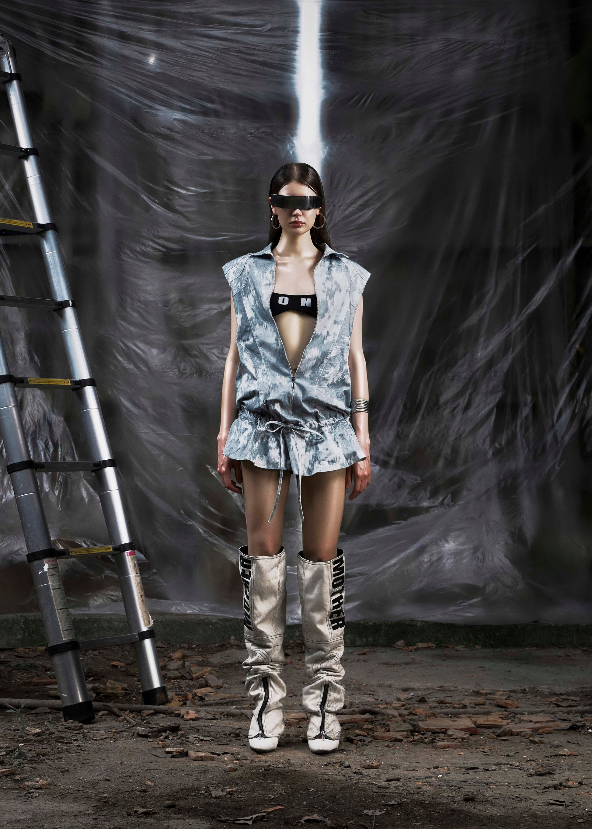 Detail: Full-body printed pattern, loose and comfortable form, padded shoulders, zipper extending to the waistline of the dress, slightly flared dress with a tie at the waistline of the dress
