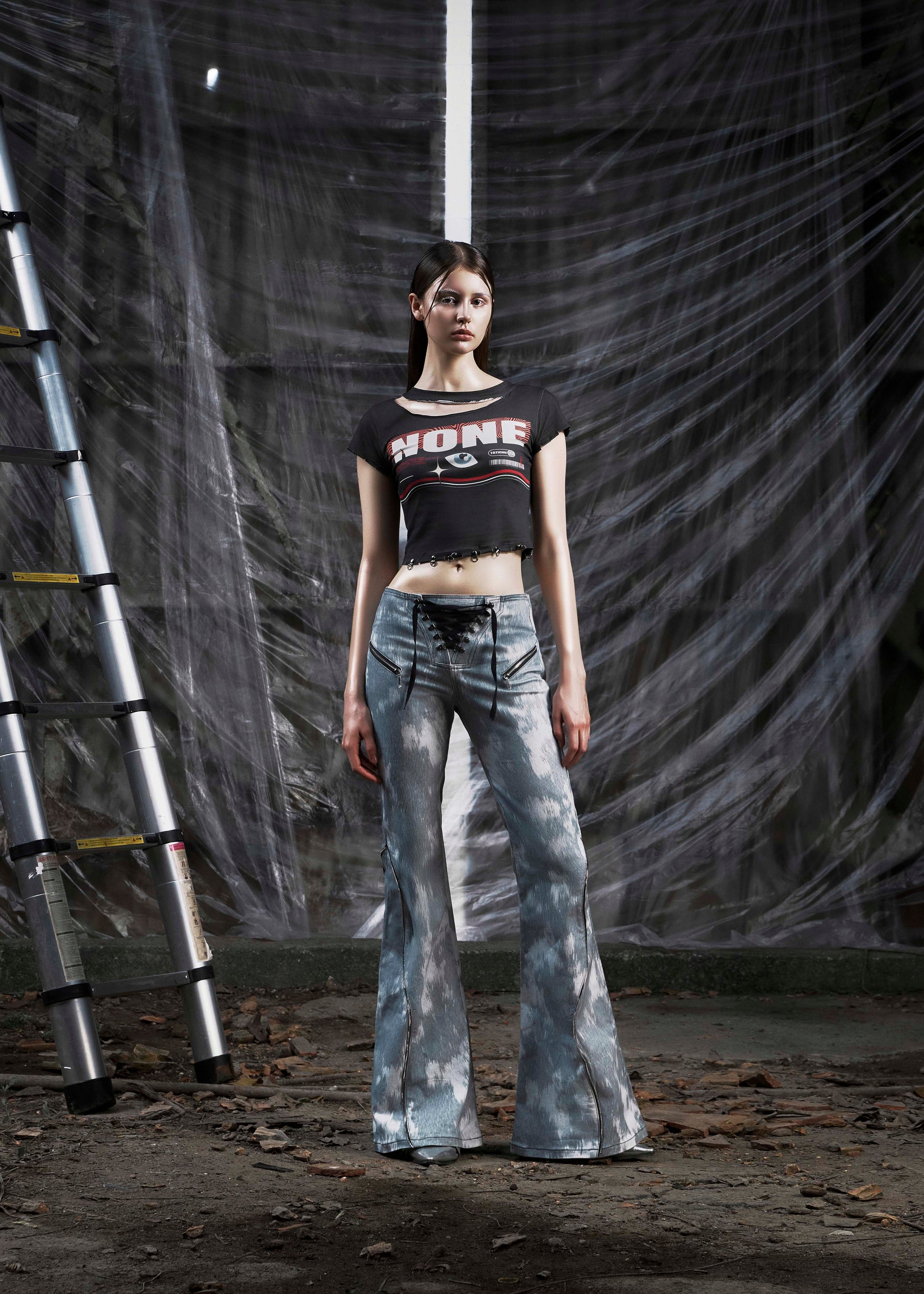 Detail: Printed pattern on front chest, right shoulder cutout collar, hem with metal zipper around